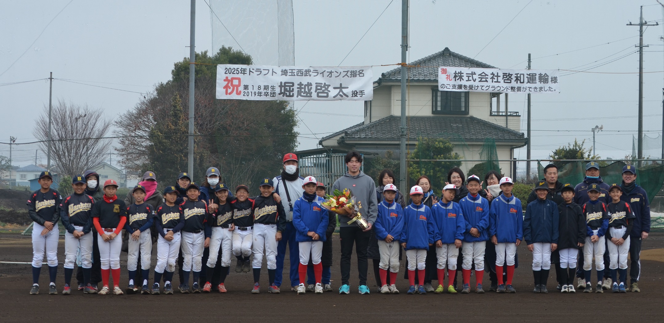 埼玉西武ライオンズ に入団が決まりました堀越啓太投手(18期生・2019年卒団、花咲徳栄高校-東北福祉大学)が12月14日にチームへの挨拶のため三ヶ島グラウンドを訪れました。 当日は雨でグラウンド・コンディションが悪化したため、中止となりました合同体験練習会のために集まっていただきました小学生選手と一緒に写真撮影の他、グラウンド整備ができた午後からは選手の練習に混ざってもらいました。 堀越投手の新たなステージでの活躍に所沢南リトルシニア一同応援いたします。 引続きたくさんの皆様の応援をよろしくお願いいたします。 | |||||||||||||||||||||||||||||||||||||||||||||||||||||||||||||||||||||||||||||||||||