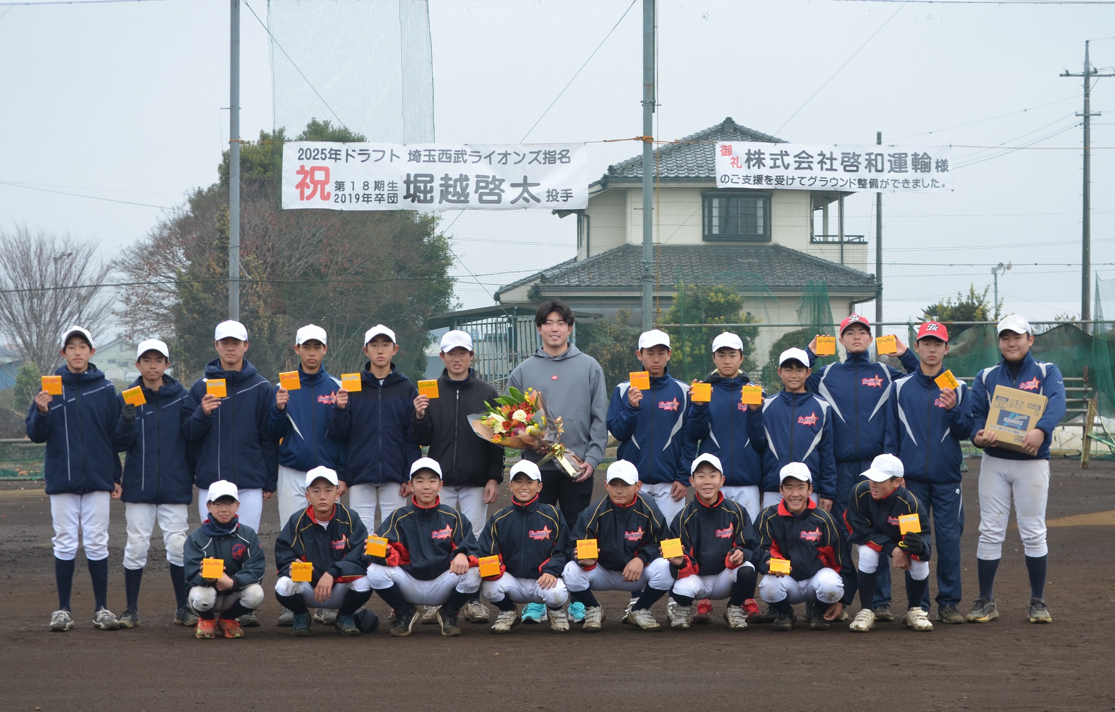 埼玉西武ライオンズ に入団が決まりました堀越啓太投手(18期生・2019年卒団、花咲徳栄高校-東北福祉大学)が12月14日にチームへの挨拶のため三ヶ島グラウンドを訪れました。 当日は雨でグラウンド・コンディションが悪化したため、中止となりました合同体験練習会のために集まっていただきました小学生選手と一緒に写真撮影の他、グラウンド整備ができた午後からは選手の練習に混ざってもらいました。 堀越投手の新たなステージでの活躍に所沢南リトルシニア一同応援いたします。 引続きたくさんの皆様の応援をよろしくお願いいたします。 | ||||||||||||||||||||||||||||||||||||||||||||||||||||||||||||||||||||||||||||||||||||